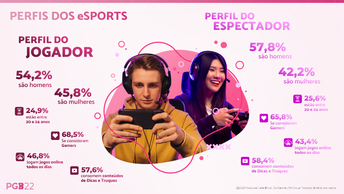 Além do consumo, outro destaque que o novo levantamento traz é a popularidade dos eSports entre os jogadores: o estudo aponta que 81,2% já ouviram falar de esportes eletrônicos, número 16,9 pontos percentuais maior em relação aos dados da PGB 2021.