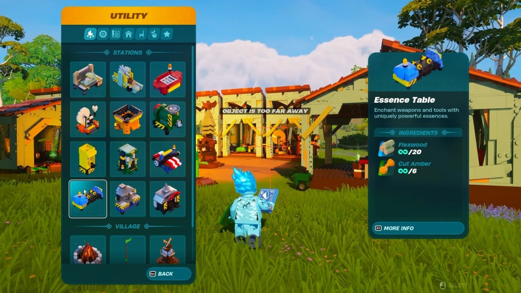 A Tabela de Essências permite que os jogadores anexem atualizações de Essência aos seus equipamentos. Isto é essencial no início do jogo, pois dará aos jogadores melhores ferramentas para ajudá-los a sobreviver em LEGO Fortnite.