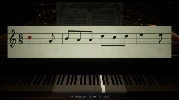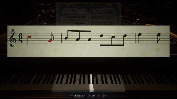 Este quebra-cabeça pode eventualmente ser resolvido mexendo nas teclas e encontrando as notas certas, mas talvez você esteja mais interessado em explodir cabeças de zumbis e fugir de Lady Dimitrescu do que fazer uma pausa para a aula de música.