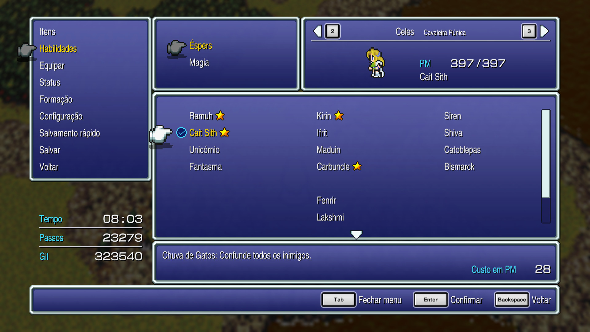 Terra é única porque começa com a habilidade de usar magia, um talento que se pensava há muito desaparecido do mundo. Mais tarde, você terá acesso ao magicite, que pode ser equipado com outros personagens para ensinar a magia contida nele. Eles também podem ser usados uma vez por batalha para convocar o esper dentro deles. Alguns espers simplesmente causam dano. Outros podem infligir aos oponentes status debilitantes, como sono ou charme, e outros ainda podem fornecer buffs ao seu grupo que tornarão as batalhas muito mais fáceis. O único problema que eu costumo ter com esse sistema é que ele de repente torna os poucos personagens mágicos que você tem redundantes quando todos os outros personagens podem aprender todos os feitiços por conta própria, mas felizmente todos eles têm suas habilidades únicas para diferenciá-los de todos os outros também.