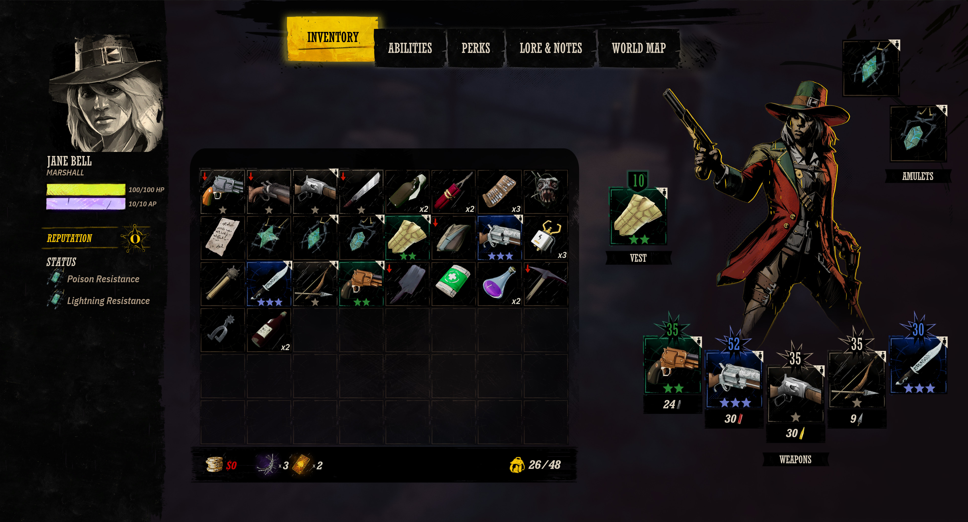 Todos os tipos de revólveres, repetidores, espingardas e dinamite estão à disposição do jogador com um sistema de atualização que recompensa os jogadores dispostos a caçar animais e minerar por um tempo. Habilidades e vantagens são desbloqueadas através de cartas Nymph Relics e Golden Ace of Spades encontradas em todo o mundo ou completando várias missões secundárias. O sistema de progressão orientado ao saque incentiva muito os jogadores a participar de muitas das missões secundárias do jogo.