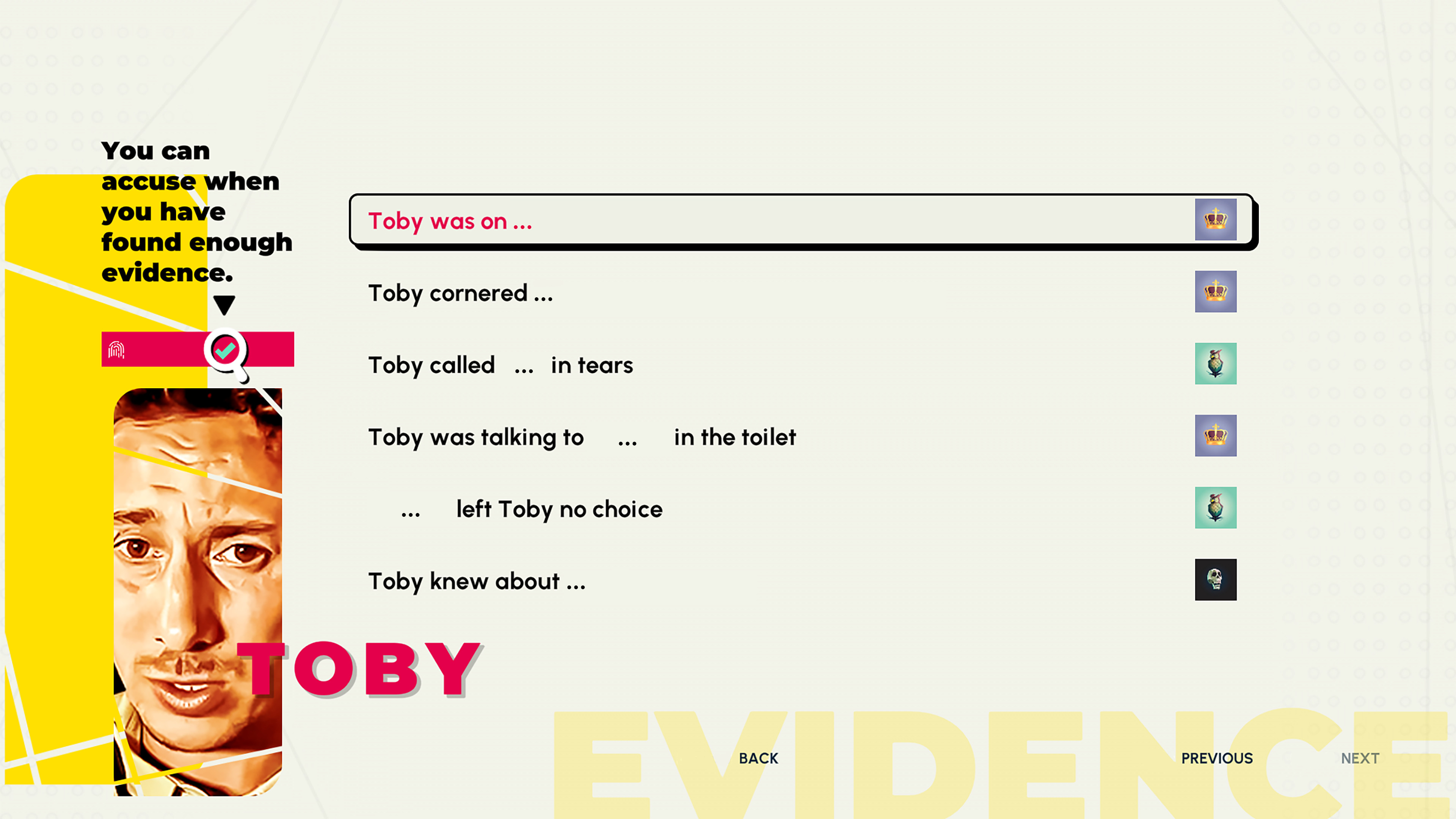 Não há realmente muita razão para escolher a escolha certa, então para as primeiras jogadas é um caso de tentar a sorte. Também está claro que não podemos resolver o mistério em uma única jogada. Qualquer evidência obtida pode ser transferida para o próximo jogo, mas para acusar alguém de envenenar Marcus, precisamos reunir uma certa quantidade de evidências contra eles. O que significa que acabei anotando quem escolhi para cada rodada, quais opções de diálogo escolhi e o que isso me trouxe. Depois de meia dúzia de voltas, comecei a me acalmar sobre o que até agora tinha sido um mistério de assassinato excêntrico e agradável, já que eu não estava investigando tanto quanto marcando caixas de seleção. O que eu gosto nesses títulos FMV de ação ao vivo da Wales Interactive é seguir uma história, fazer escolhas difíceis e ver onde isso me leva. Aqui, eu estava apenas percorrendo as mesmas cenas metodicamente escolhendo as opções que esperava que me reunissem um novo fragmento de evidência. Uma corrida completa é bem curta, menos de uma hora na primeira cena, depois uma questão de 30 minutos ou menos quando sabemos o que estamos procurando.
